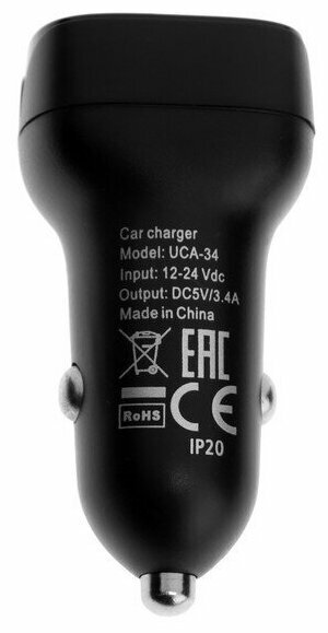 Автомобильное зарядное устройство UCA-34, 2 USB, 3.4 А, индикатор, черное