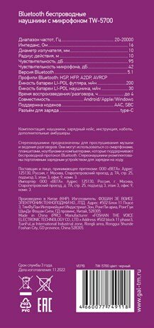 Наушники TWS Gal TW-5700 черный [2.0, внутриканальные, 20 Гц - 20000 Гц, 16Ω, Bluetooth, 5.0] интересное: