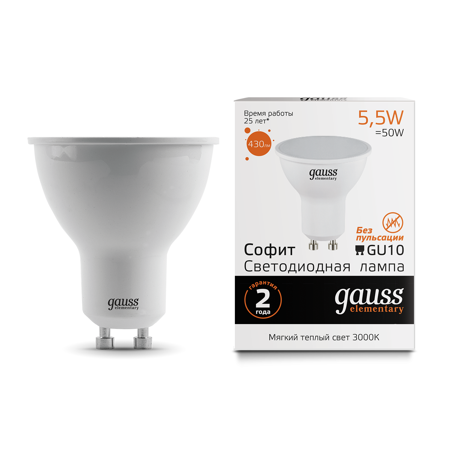 Лампочка светодиодная Gauss Elementary 5.5В эквивалент 50В 3000K 430Лм GU10 для спотов MR16 13616 (комплект из 2 шт.)
