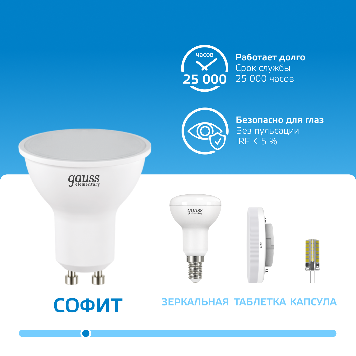 Лампочка светодиодная Gauss Elementary 5.5В эквивалент 50В 3000K 430Лм GU10 для спотов MR16 13616 (комплект из 5 шт.)
