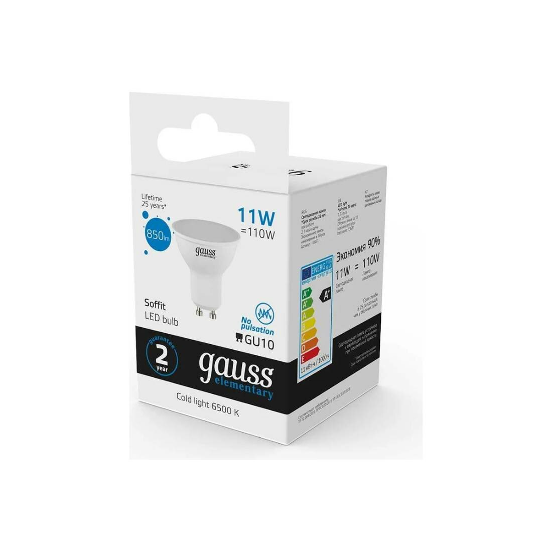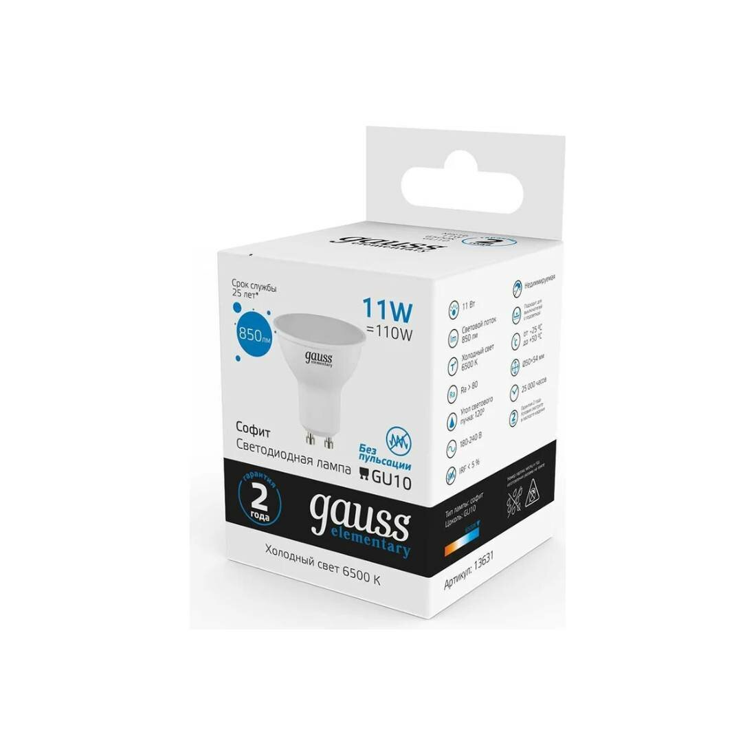 Лампочка светодиодная Gauss Elementary 11В эквивалент 110В 6500K 850Лм GU10 для спотов MR16 13631 (комплект из 2 шт.)