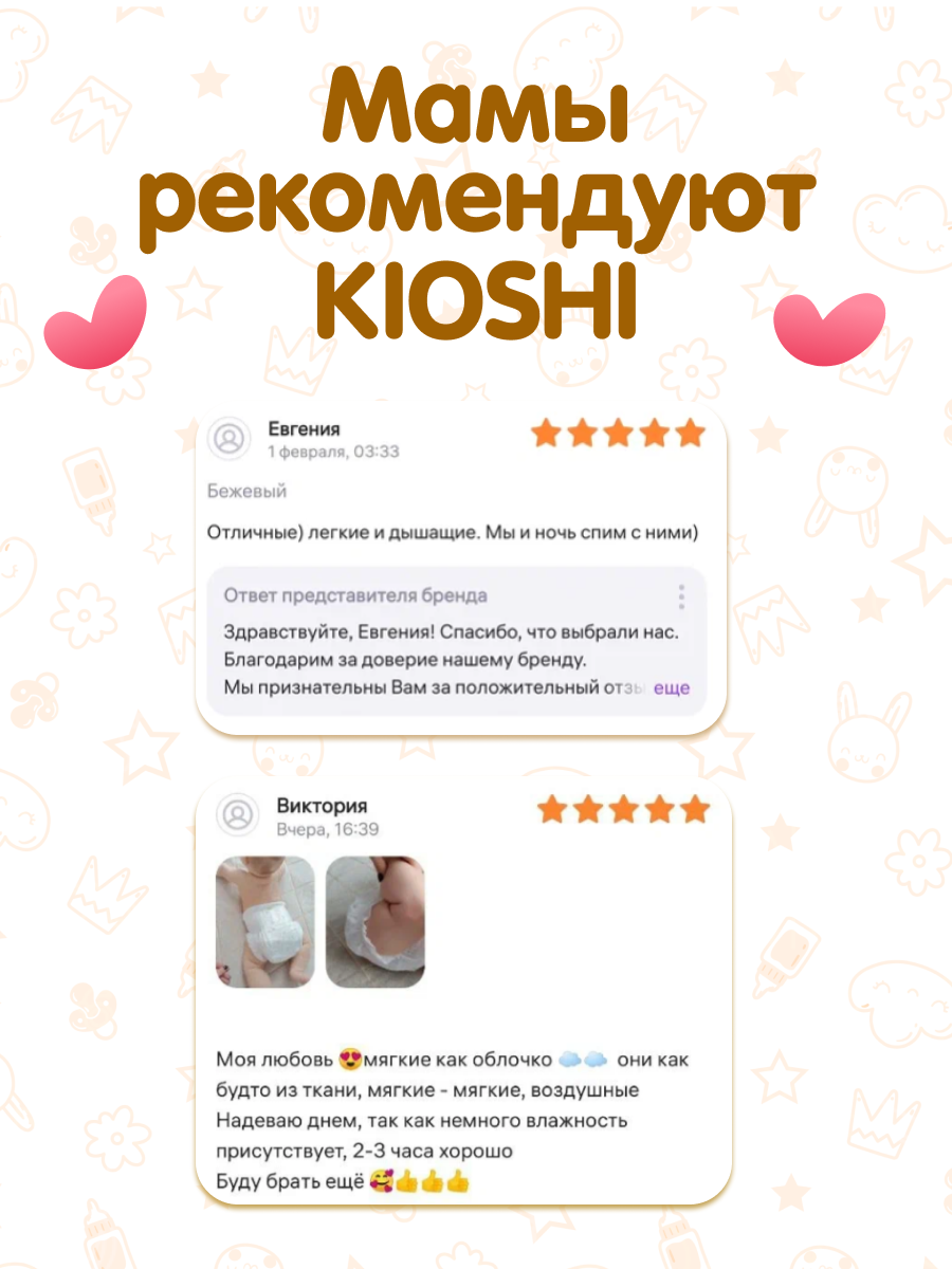 | Отзыв: | С подгузники-трусики от Киоши мы давно знакомы со всей линейкой мы их полюбили малышу комфортно,нет ни аллергии ни раздрожения, попка сухая выдерживают всю ночь.Сами подгузники-трусики тоненькие и мягкие ,качество шикарное и цена радует нас.Будем брать ещё спасибо огромное продавцу за качество. |