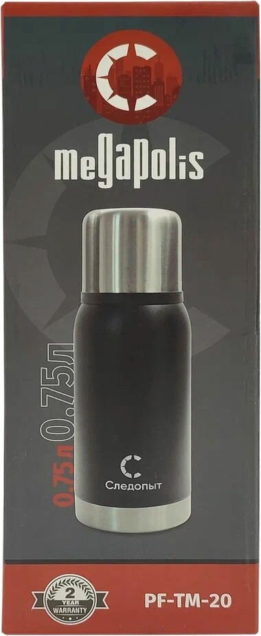 Термос Следопыт Мегаполис PF-TM-20, стальной, 0,75 л, вакуумный, черный/серебристый