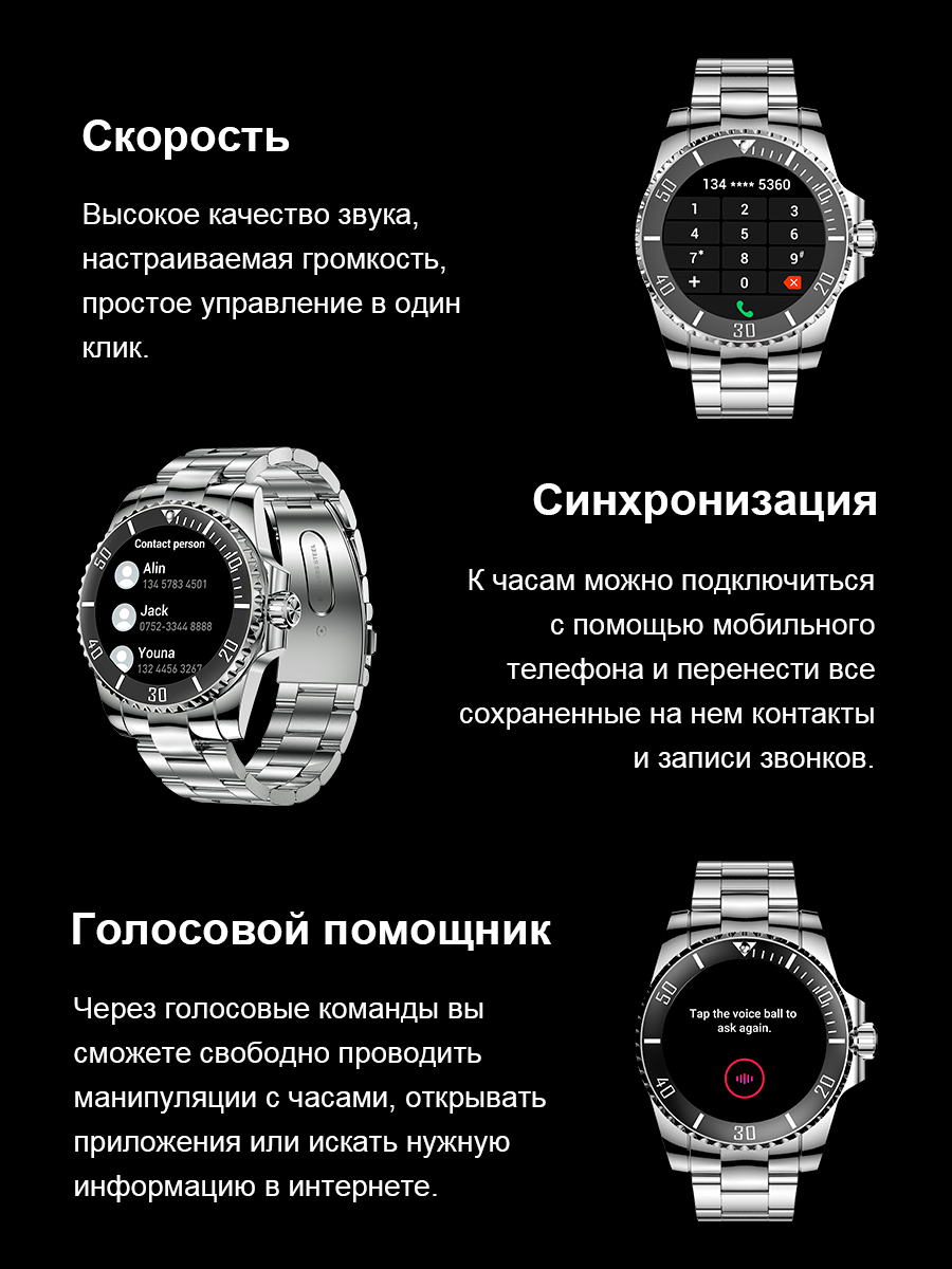 Купить Смарт-часы умные наручные SMART PRESENT 15 мужские, круглые, с функцией телефона, водонепроницаемые, серебристые, металл