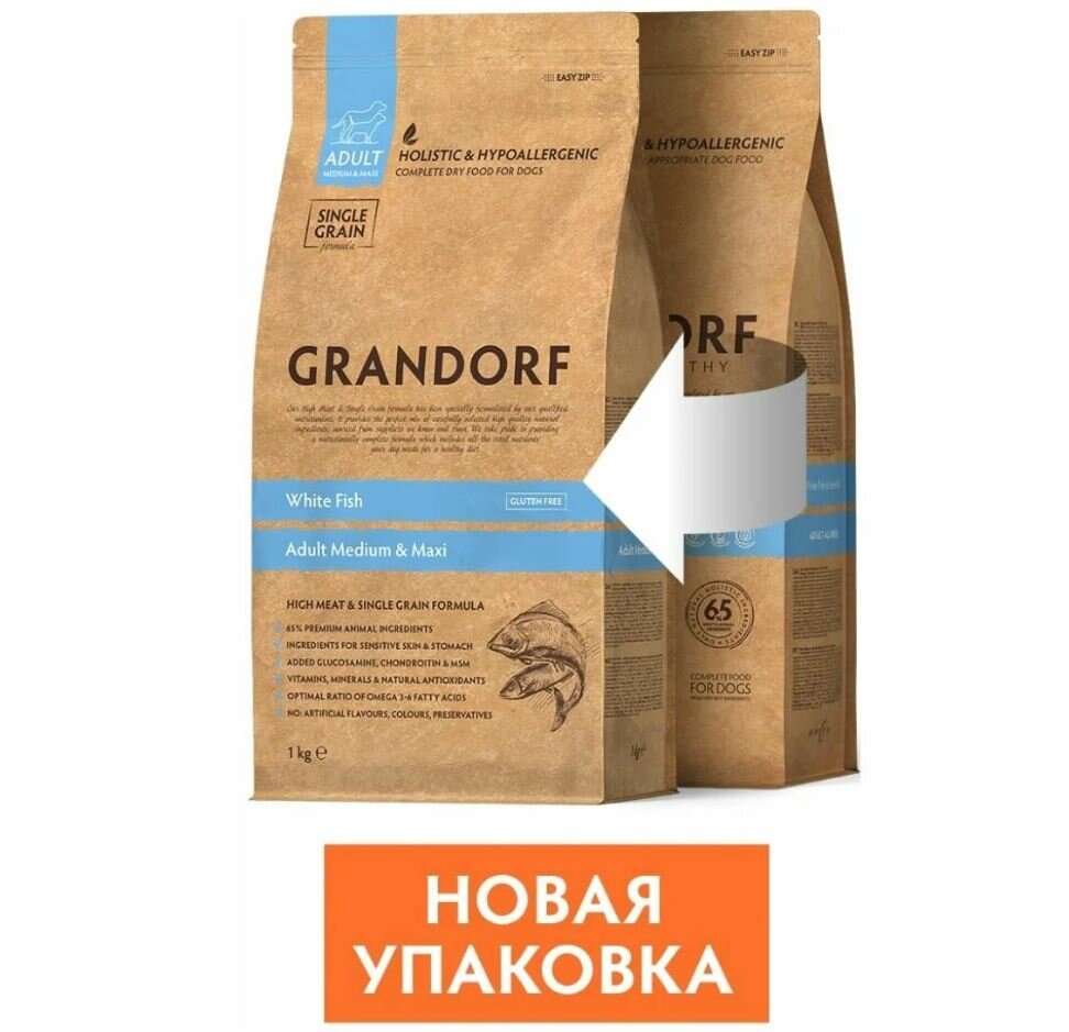 GRANDORF SINGLE GRAIN DOG ADULT MEDIUM & MAXI WHITE FISH низкозерновой для взрослых собак средних и крупных пород с белой рыбой (1 кг х 6 шт)