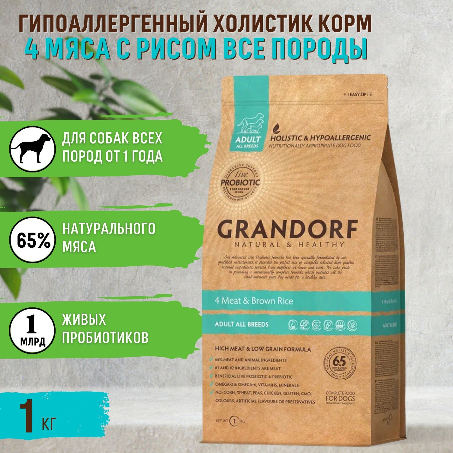 GRANDORF ADULT ALL BREEDS LIVING PROBIOTICS 4 MEAT & BROWN RICE для взрослых собак всех пород низкозерновой с мясом и коричневым рисом (3 кг)