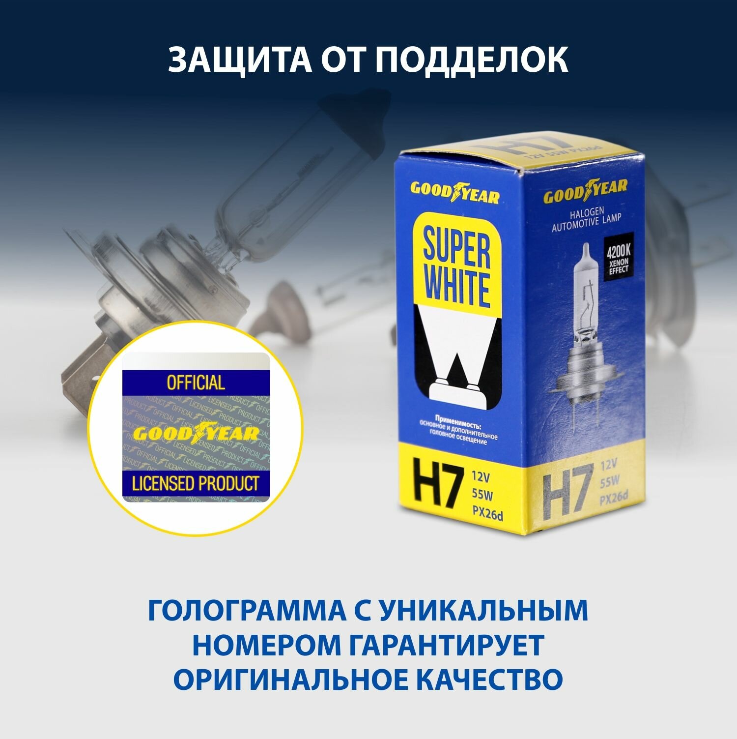 Лампа галогеновая головного света H7 PX26d 12V 55W Super White картон 1шт, GOODYEAR GY017126