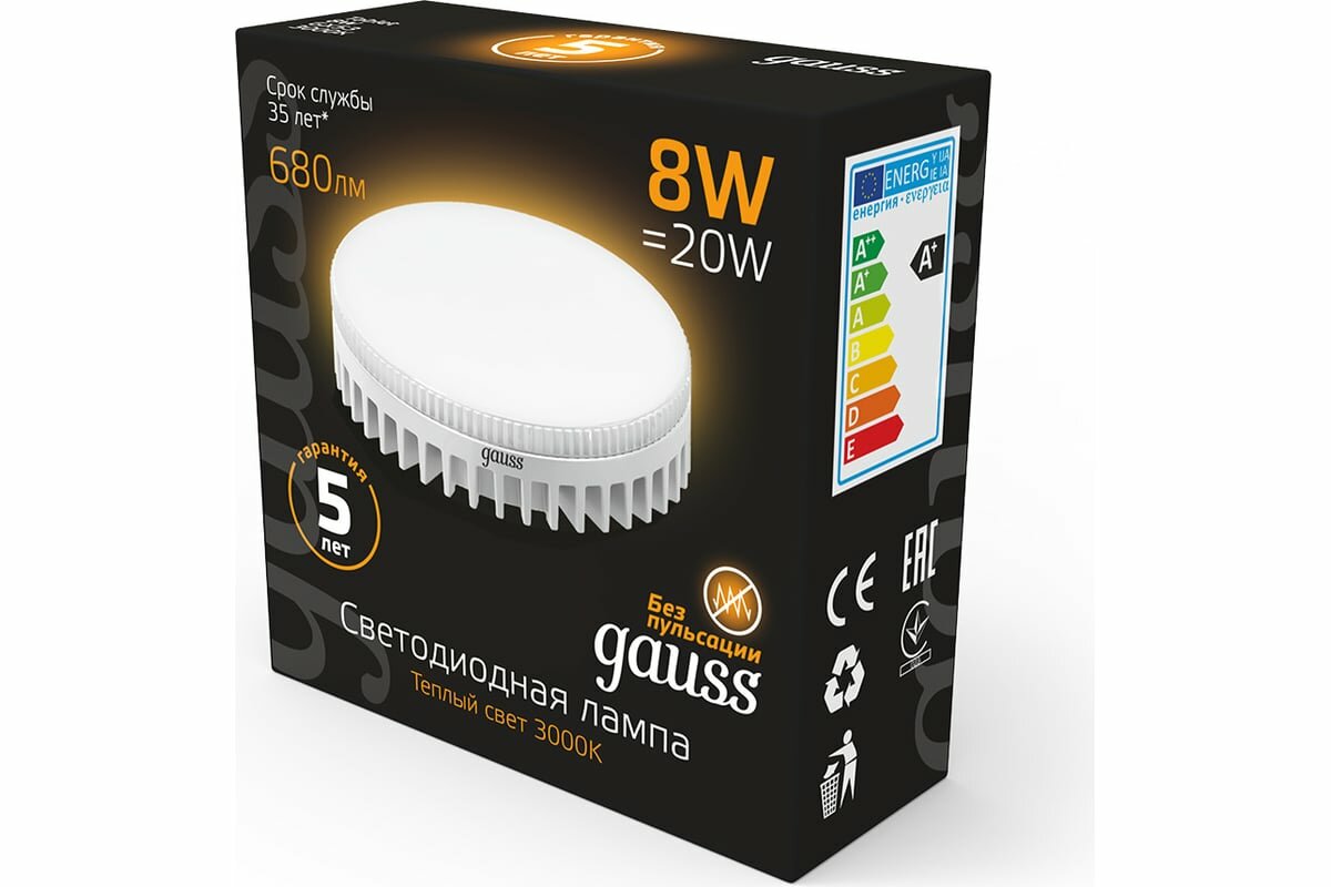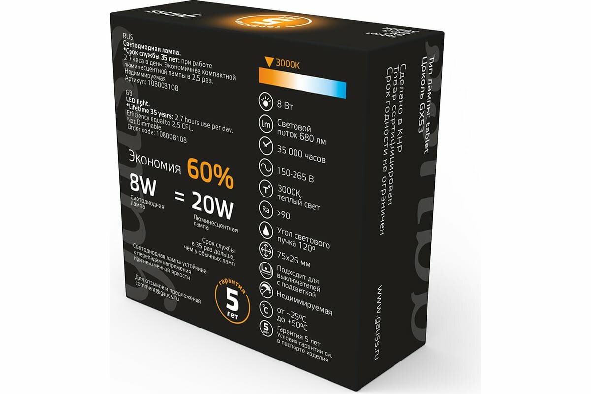 (1 шт) Лампа Gauss GX53 8W 680lm 3000K LED 1/10/100