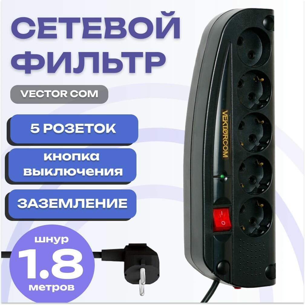 Сетевой фильтр Vektor COM, 5 розеток, черный 1.8м, компьютерный интересное:
