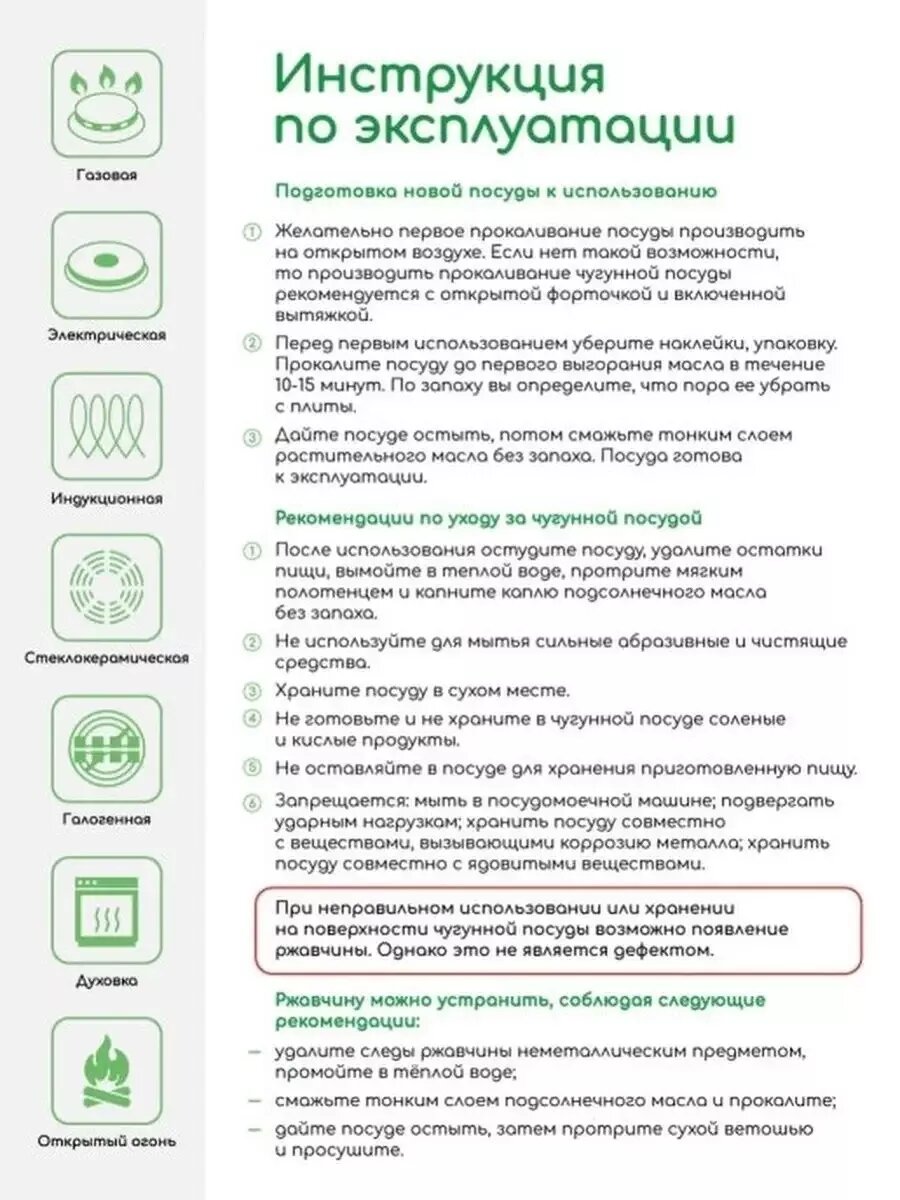 | Минусы: | После прокаливания чугун (как написано в описании и на этикетке) стал сине зелёным.... |