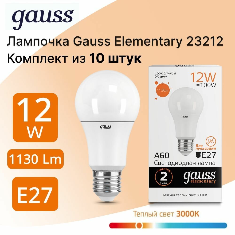Купить 10шт. Gauss Лампа Elementary A60 12W 1130lm 3000K E27 LED, 23212
