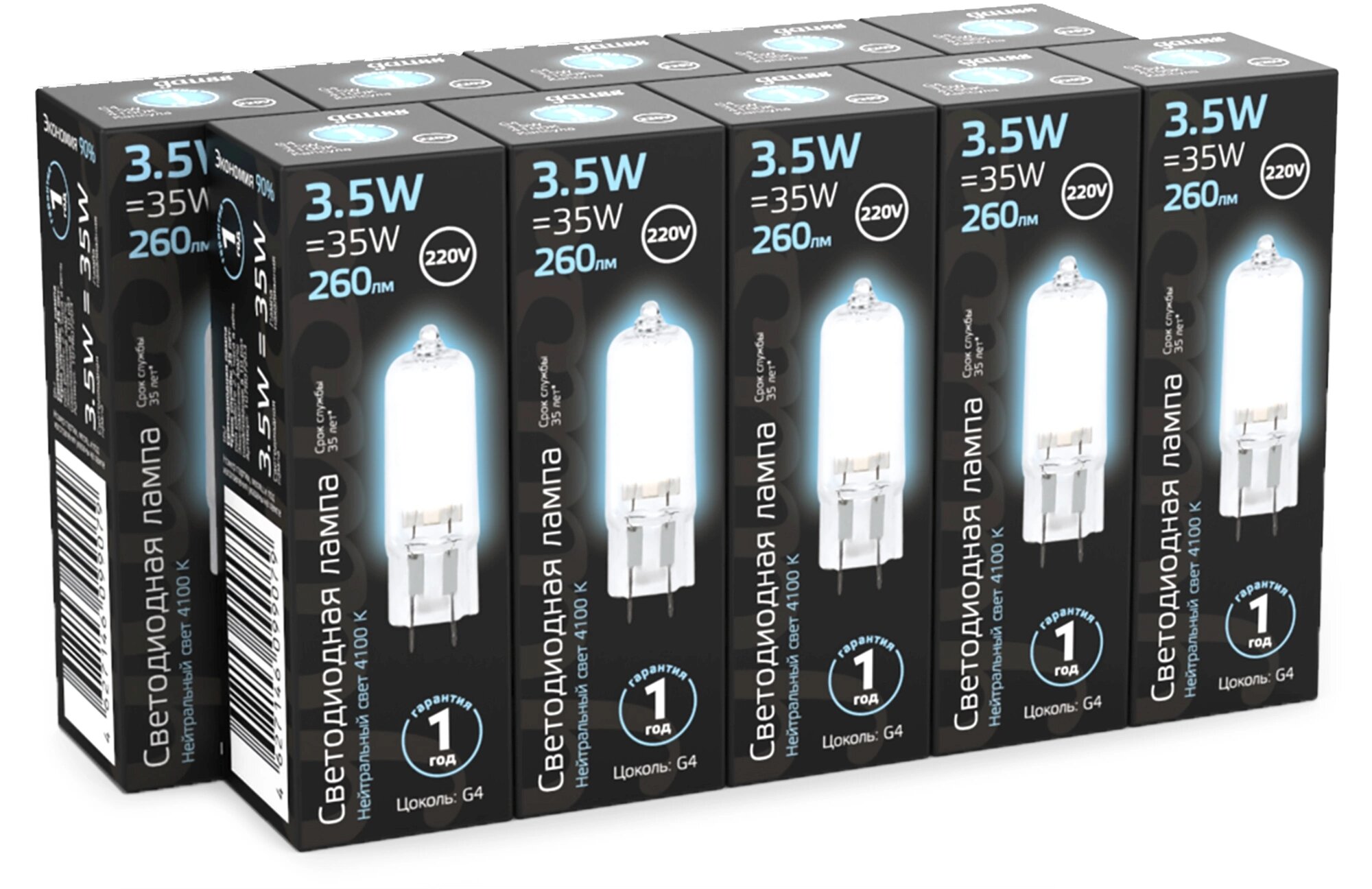 Упаковка ламп 10шт Gauss G4 AC220-240V 3.5W 260lm 4100K стекло LED 1/10/200