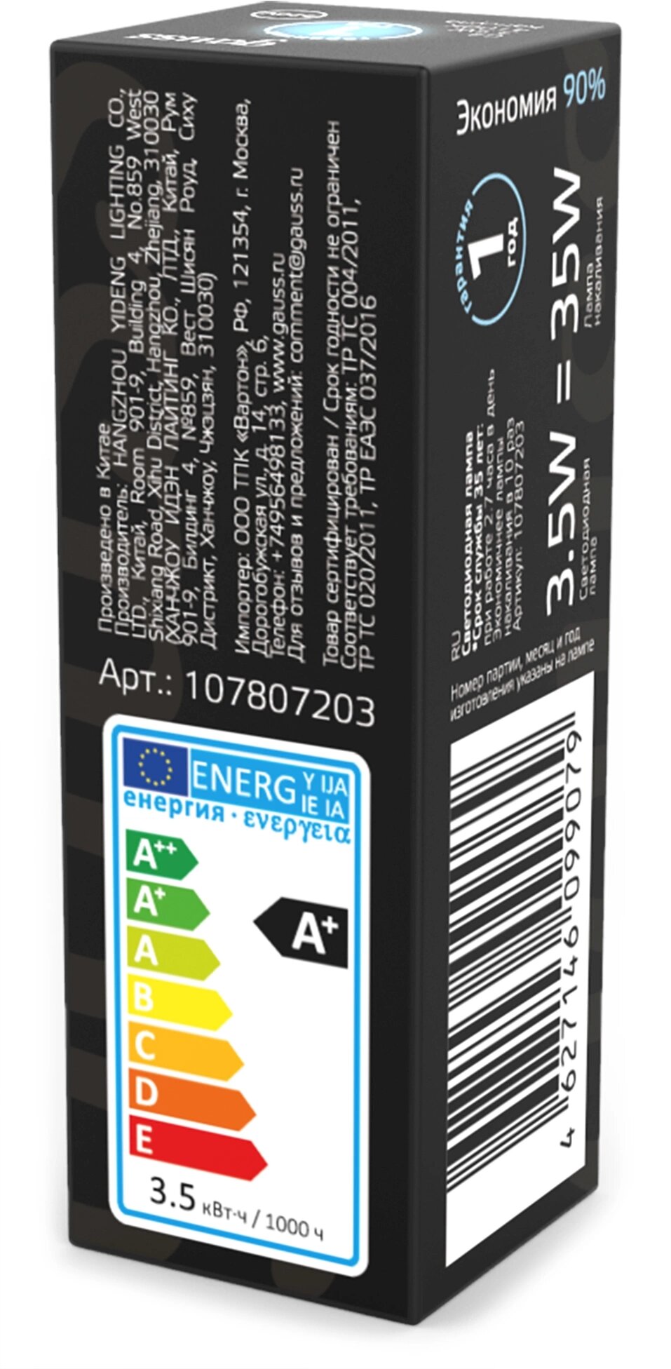 | Эквивалент лампы накаливания | 35 Вт |
