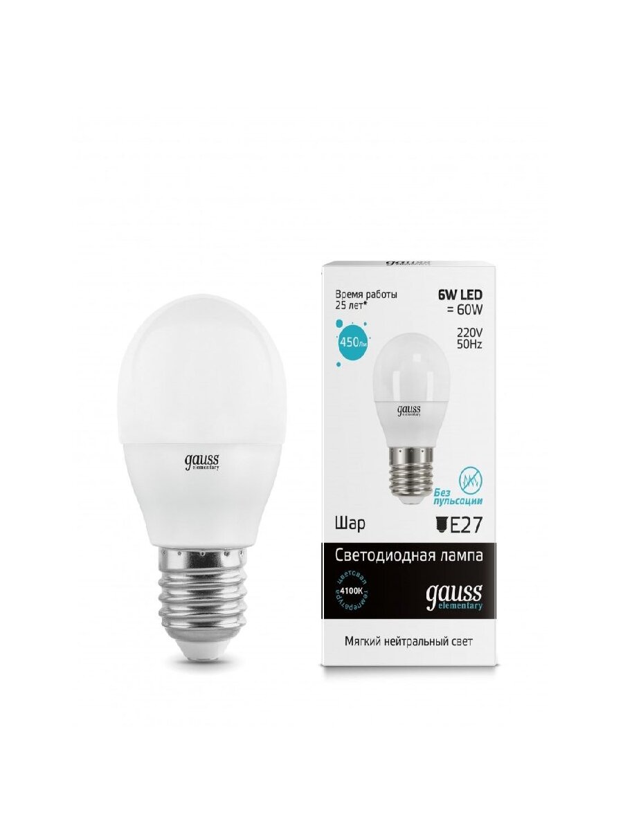 (5 шт.) Светодиодная лампочка Gauss Elementary Шар G45 E27 6W(450lm) 4100K 4K 82x45 матовая, пластик/алюм. 53226 Нейтральный белый. Цоколь E27