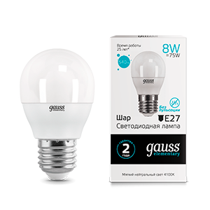 (20 шт.) Светодиодная лампочка Gauss Elementary Шар G45 E27 8W(520lm) 3000K 2K 82x45 матовая, пластик/алюм. 53218 Нейтральный белый. Цоколь E27