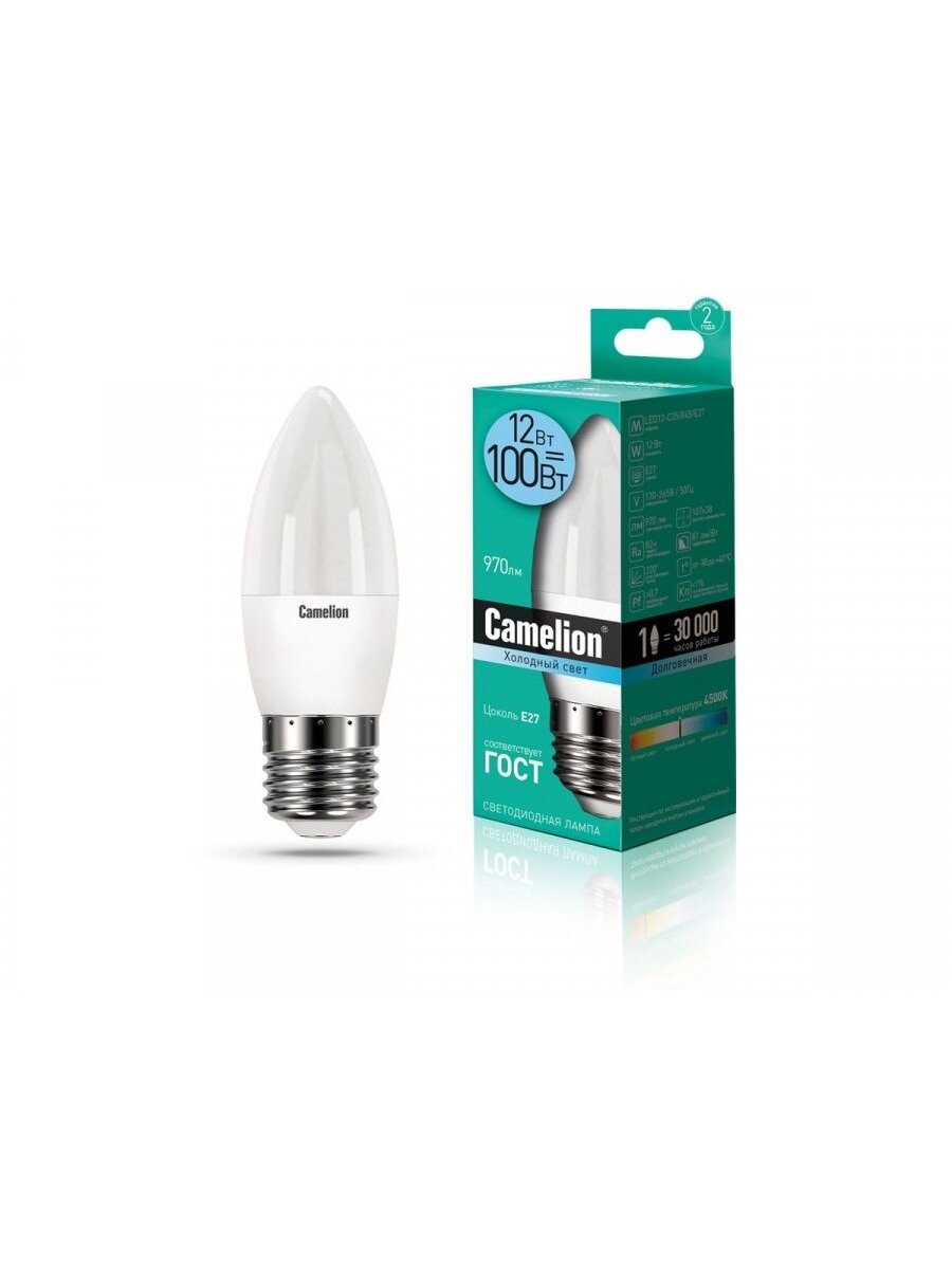 (10 шт.) Светодиодная лампочка Camelion Свеча E27 12W(970lm 220°) 4500K 4K матов. 107x38 пластик LED12-C35/845/E27 Нейтральный белый. Цоколь E27