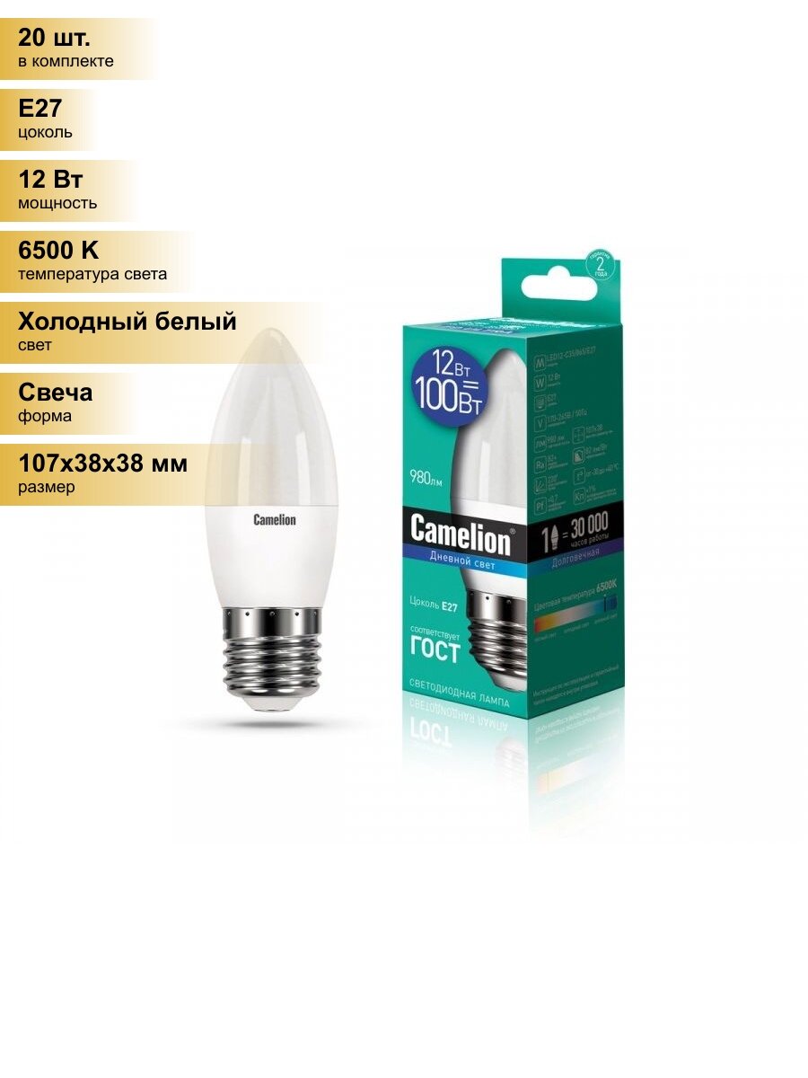 Сохранить(20 шт.) Светодиодная лампочка Camelion Свеча E27 12W(980lm 220°) 6500K 6K матов. 107x38 пластик LED12-C35/865/E27 Холодный белый. Цоколь E27 интересное: