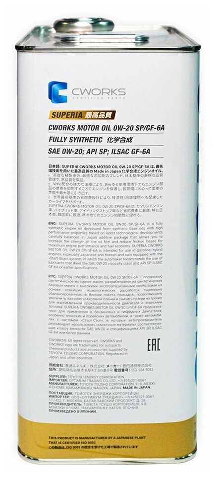 СохранитьМоторное масло CWORKS SUPERIA MOTOR OIL 0W-20 SP/GF-6A, 4L A11SR1004 интересное: