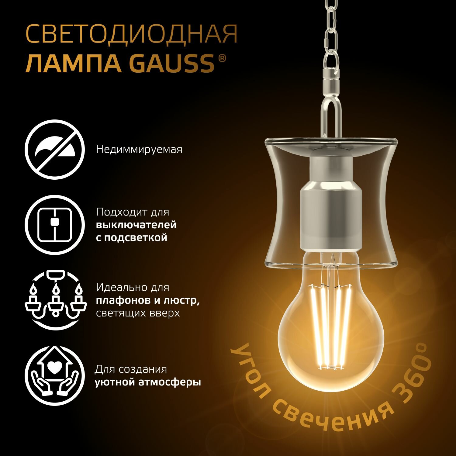 Лампа филаментная Gauss 6Вт цок.:E27 шар 220B 2700K св.свеч.бел.теп. A60 (упак.:10шт) (102802106)
