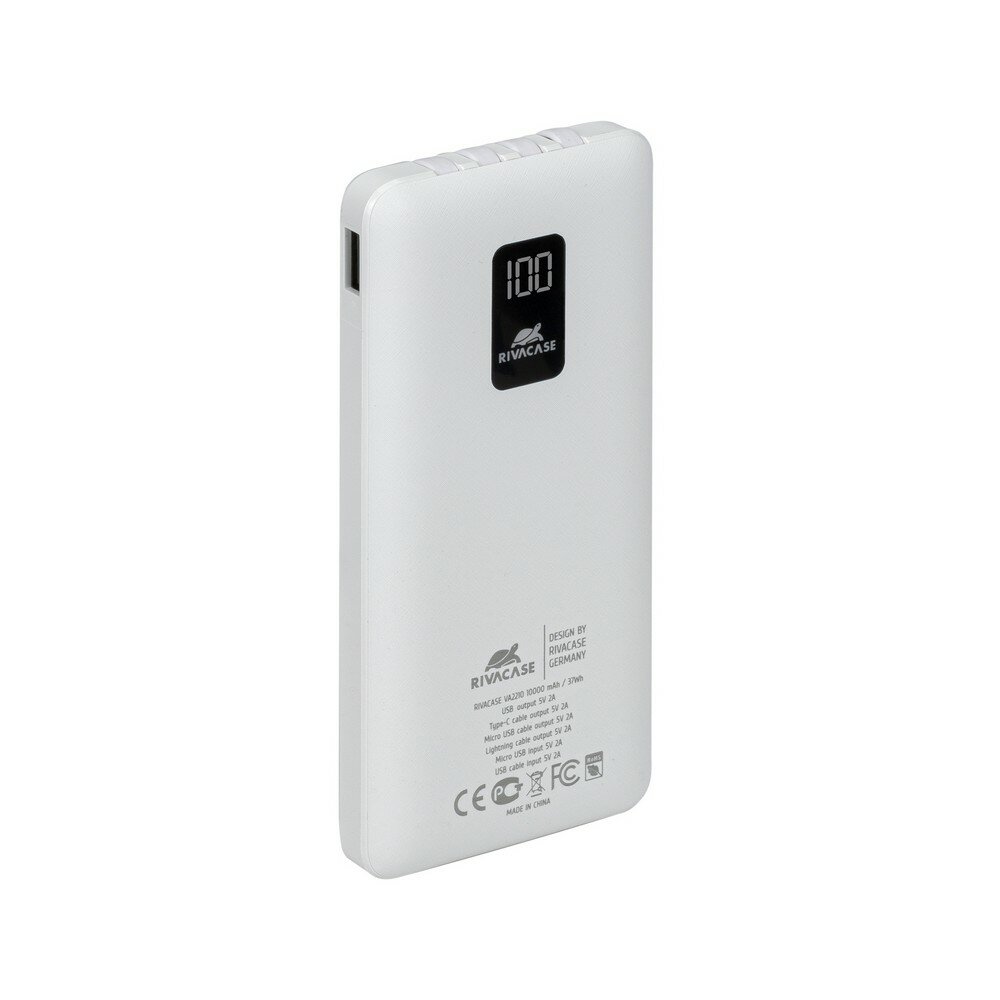 RIVACASE VA2210 (10000 мАч) внешний аккумулятор с дисплеем и встроенными кабелями, белый, 12/48