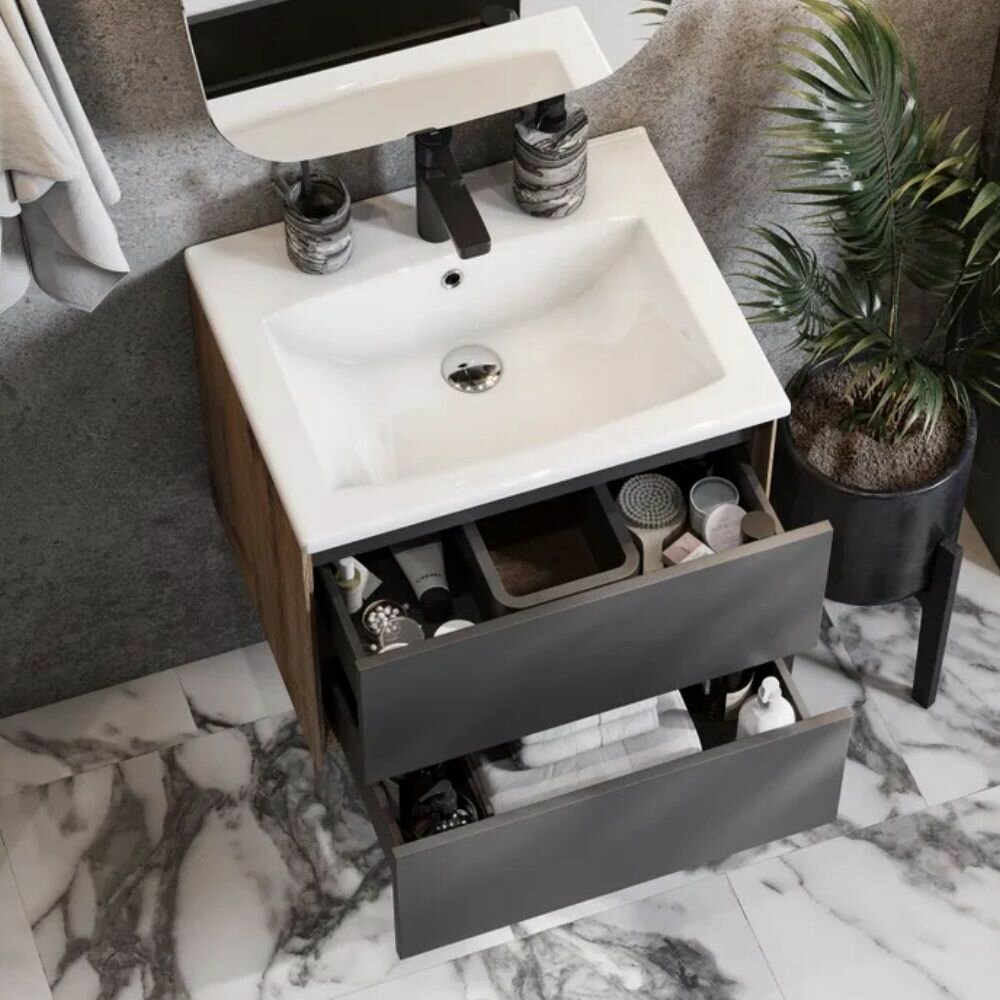 Купить Тумба с раковиной для ванной с двумя выдвижными ящиками AQUATON 1A2580K1AJA00 Сохо 60 дуб веллингтон/графит софт, раковина Элина 60
