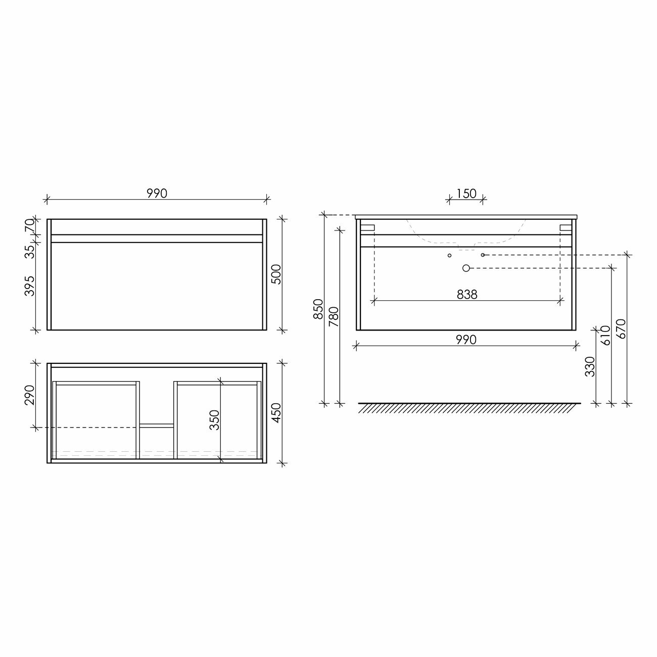 Купить Тумба подвесная Sancos Smart 990х450х500 мм, c двумя ящиками оснащенными доводчиками, белый глянец, (без раковины) (SM100W)