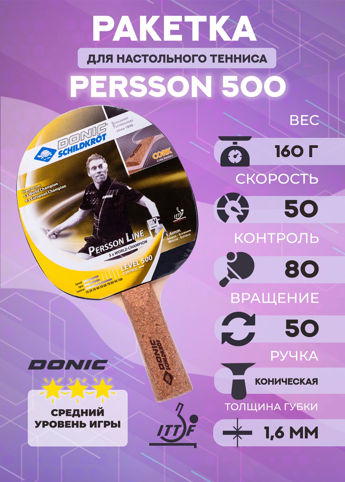 Ракетка для настольного тенниса Donic Persson 500 с конической рукояткой интересное: