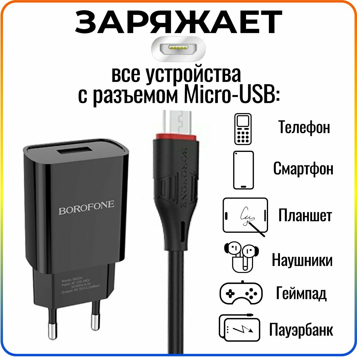 Быстрая зарядка для телефона с кабелем Micro-USB в комплекте / для смартфонов Android / сетевое зарядное устройство / адаптер питания / BOROFONE BA20A