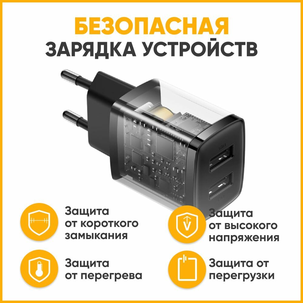 Сетевое зарядное устройство Baseus Compact 10.5W 2 USB,черный / Адаптер питания сетевой USB-A / Блок питания для телефона, быстрая зарядка / Переходник для розетки
