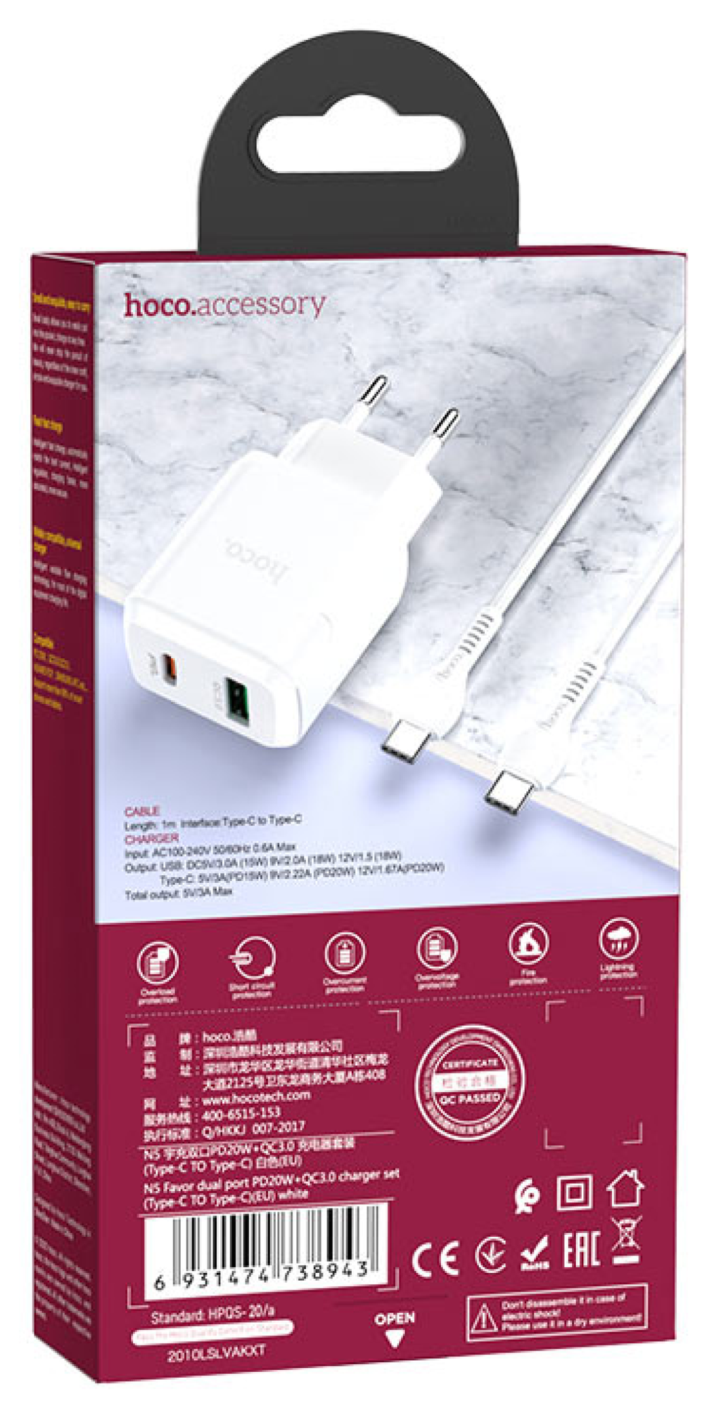 Сетевое зарядное устройство + кабель Type-C to Type-C N5 PD+QC3.0 20W белый Hoco