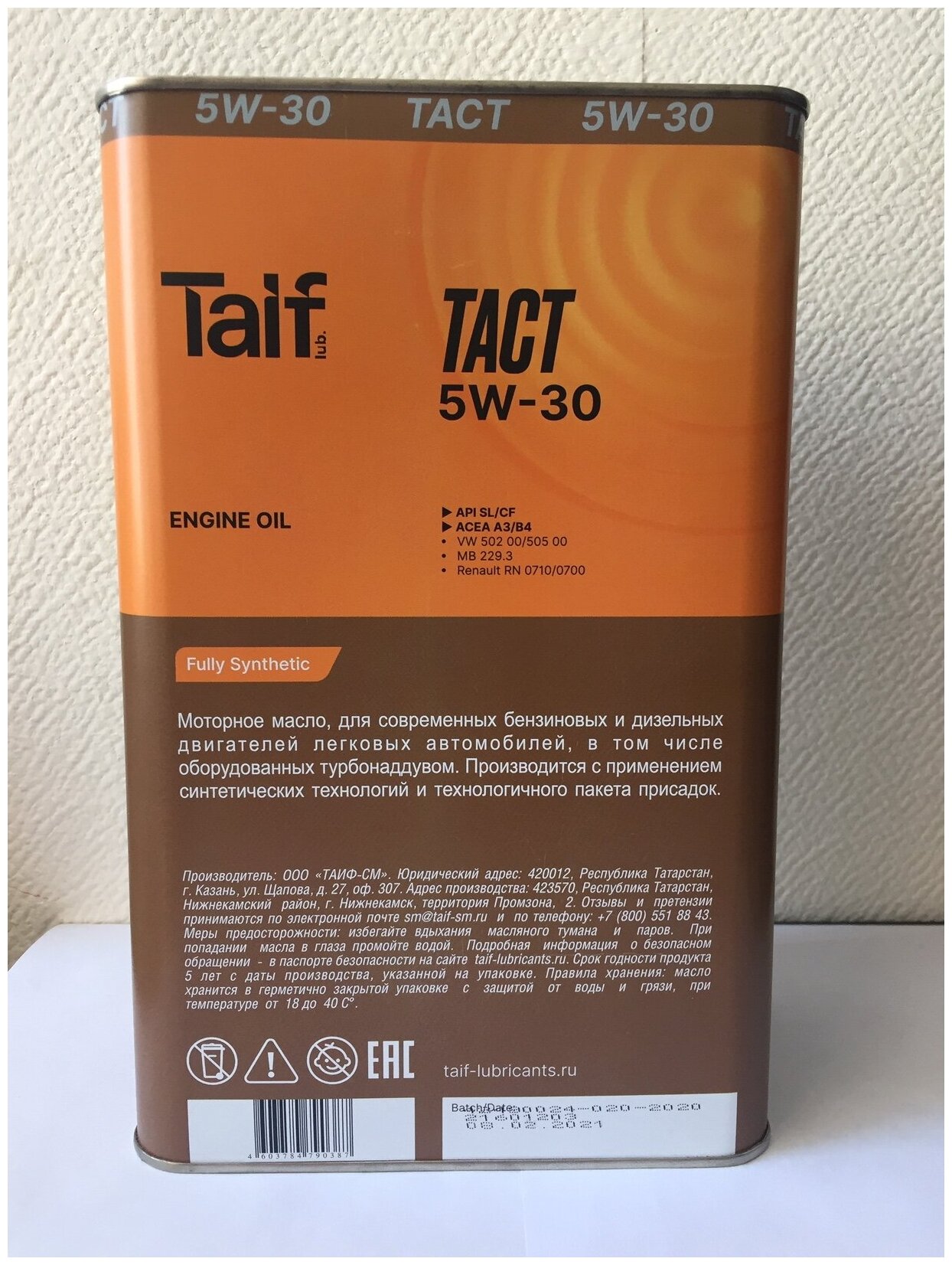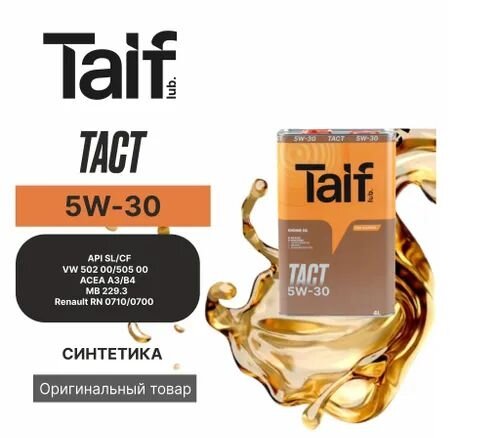 TAIF Lubricants Taif Масло Моторное Tact 5w-30, 4l Api Sl/Cf, Vw 502 00/505 00, Acea A3/B4, Mb 229.3, Renault Rn