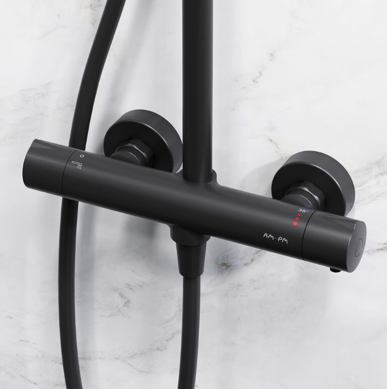 Купить Душевая система AM.PM Like F0780422 смеситель для душа термостатный, верхний/ручной душ, черный