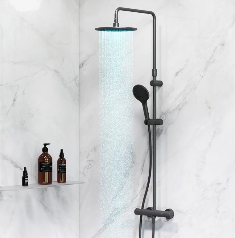 Душевая система с термостатом AM. PM Like F0780422 черный, смеситель для душа, верхний душ 220 мм
