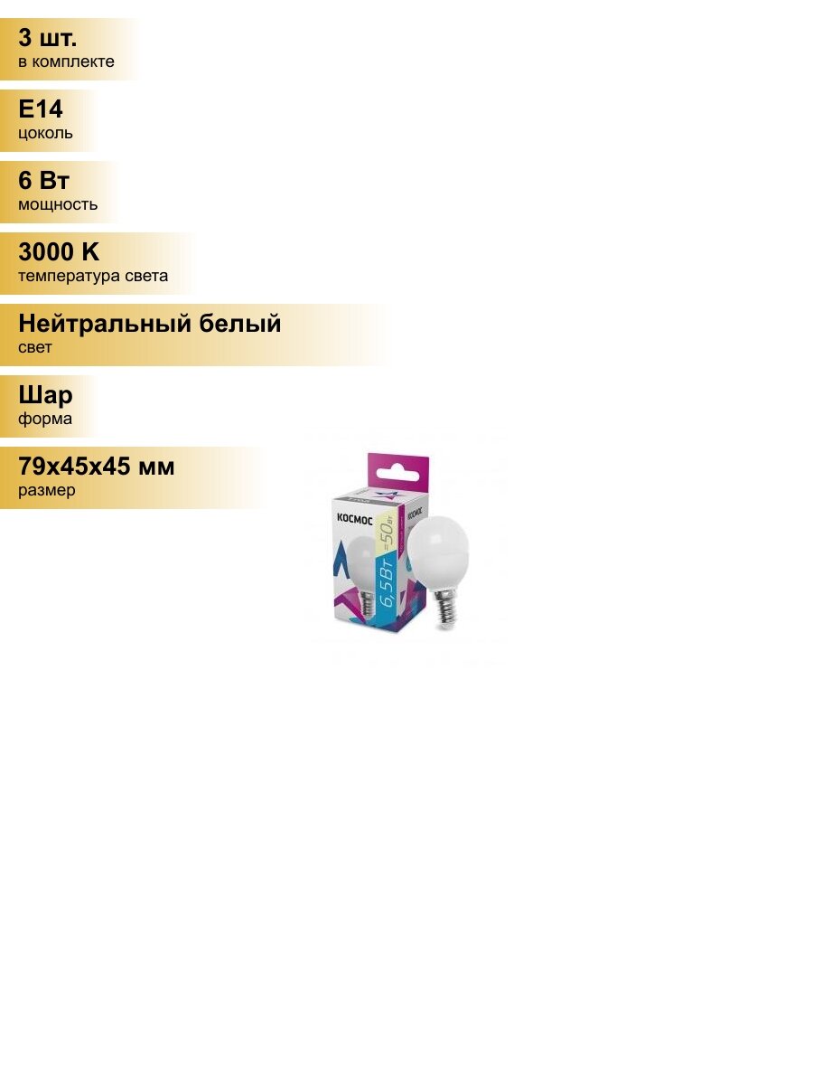 Купить (3 шт.) Светодиодная лампочка Космос шар E14 6,5W (6W) (460lm) 3000K 2K матов. 79x45 LkecLED6.5wGL45E1430 Нейтральный белый. Цоколь E14