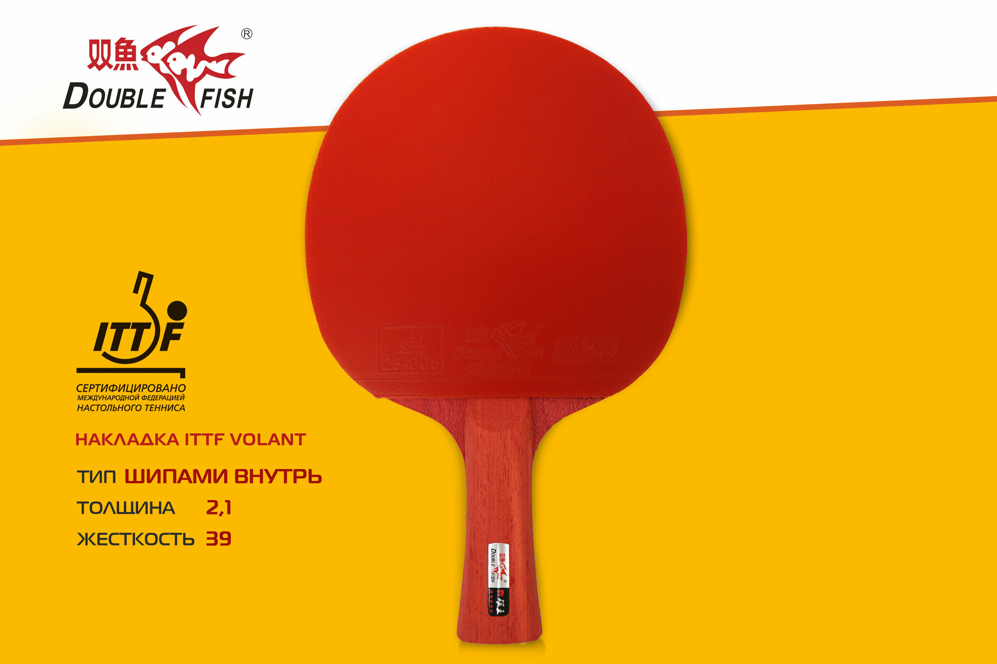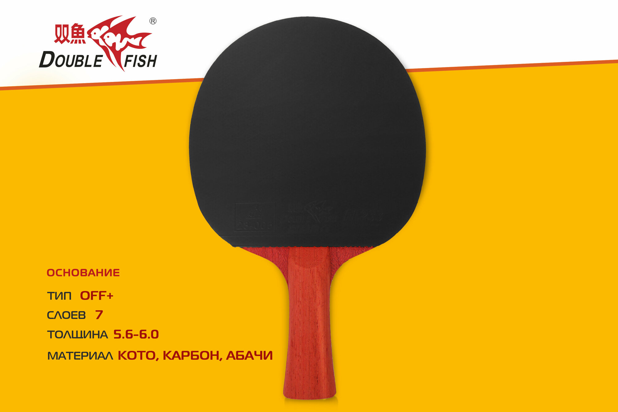 Ракетка для н/т Double Fish, 6A+C, для подвин.,ITTF Appr.,накл. 2,1 мм, конич. ручка+ 2 мяча V40+мм
