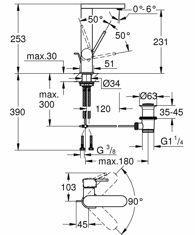 Смеситель однорычажный для раковины GROHE Plus со сливным гарнитуром, поворотный излив, L-Size (23851003)