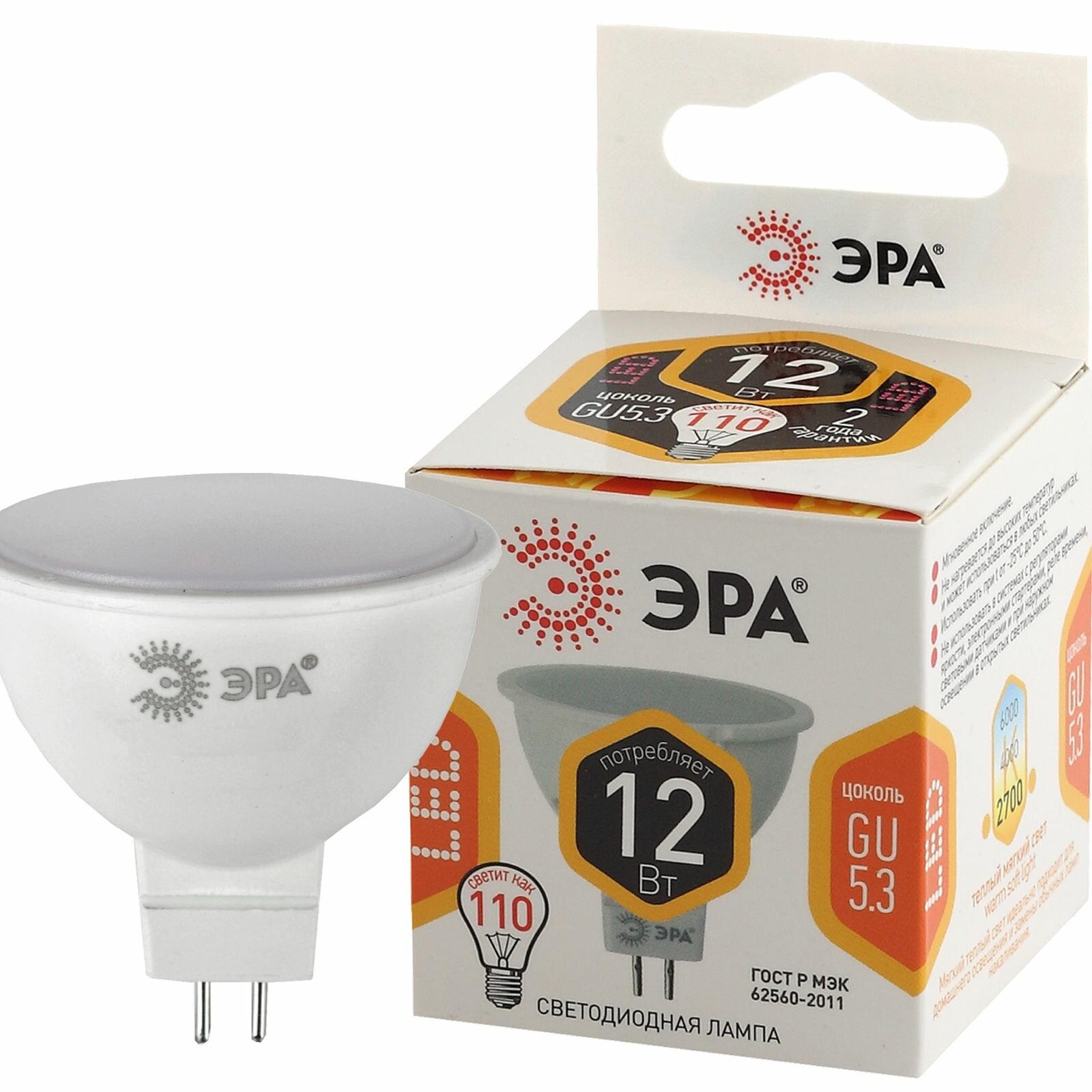 Светодиодная лампа ЭРА 12W эквивалент 110W 2700K 960Лм GU5.3 для спотов MR16