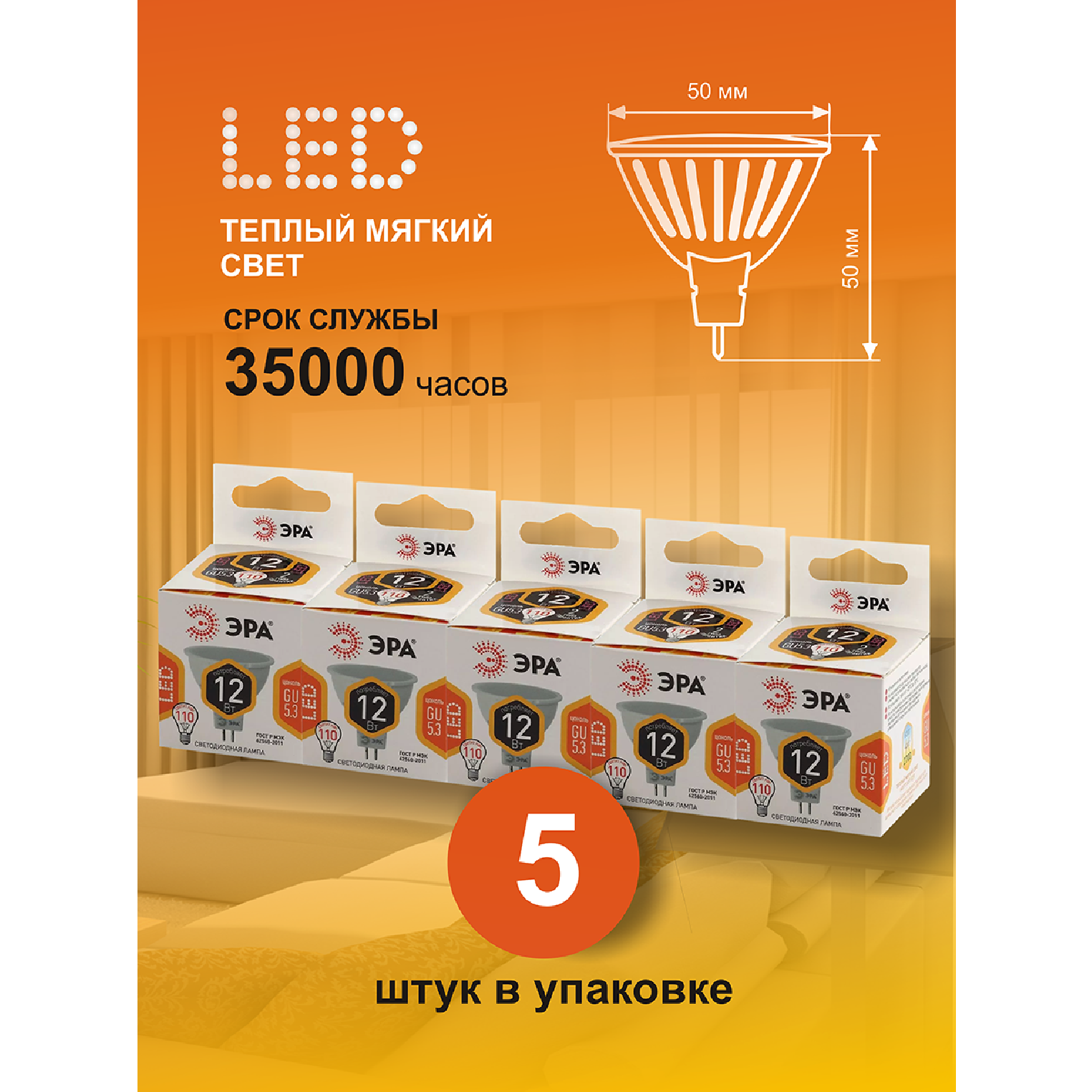 Купить Лампочка светодиодная ЭРА (набор 5 штук) STD LED MR16-12W-827-GU5.3 GU5.3 12ВТ софит теплый белый свет
