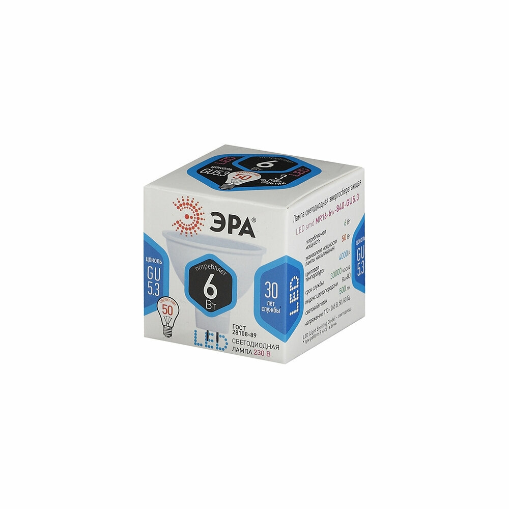 (5 шт.) Светодиодная лампочка ЭРА стандарт MR16 GU5.3 220V 6W(500lm) 4000K 4K 50x50 MR16-6w-840-GU5.3 6162 Нейтральный белый. Цоколь GU5.3