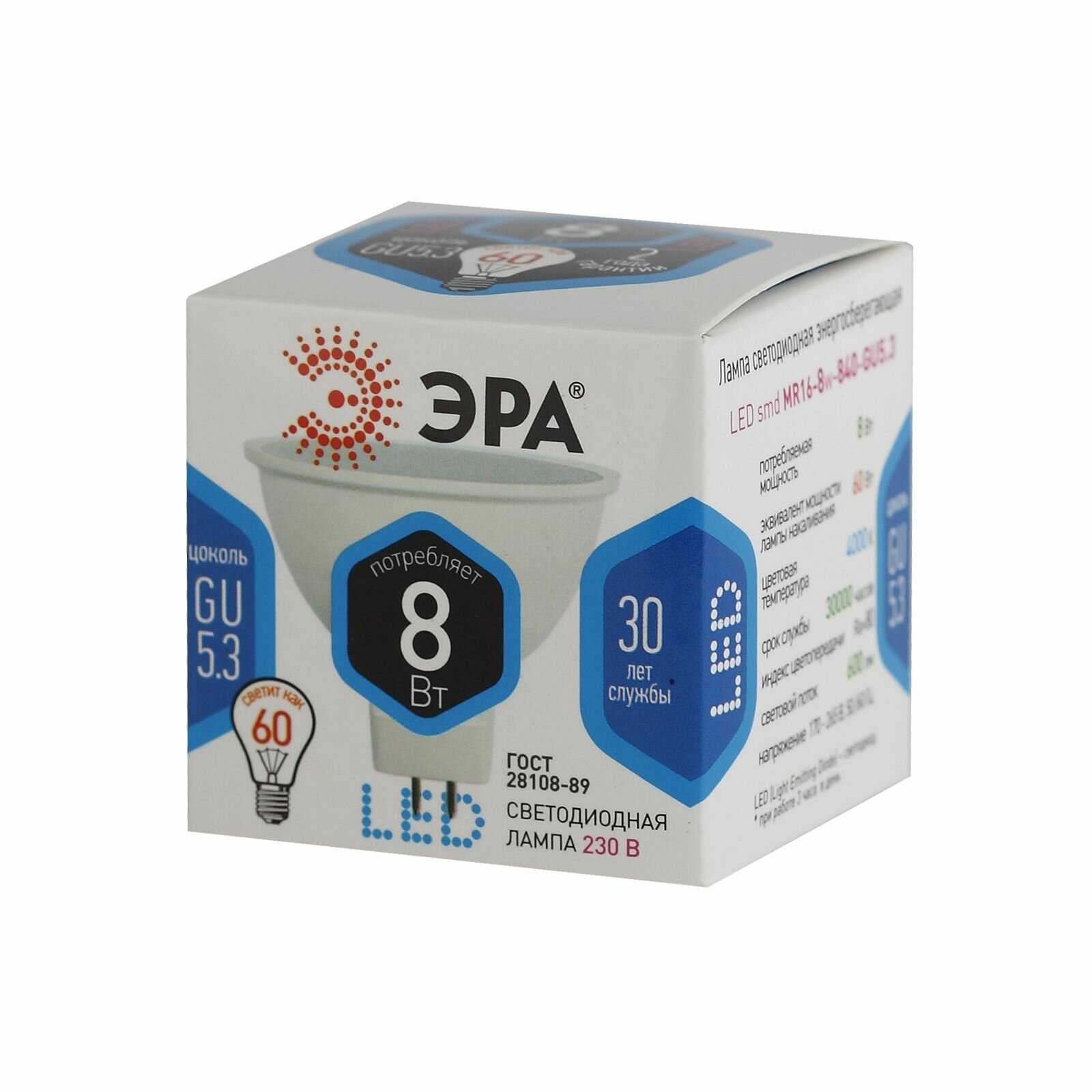 (10 шт.) Светодиодная лампочка ЭРА стандарт MR16 GU5.3 220V 8W(600lm) 4000K 4K 50x50 MR16-8w-840-GU5.3 6186 Нейтральный белый. Цоколь GU5.3