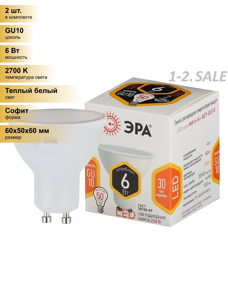 Купить (2 шт.) Светодиодная лампочка ЭРА стандарт MR16 GU10 220V 6W(480lm) 2700K 2K MR16-6w-827-GU10 6148 Теплый белый. Цоколь GU10