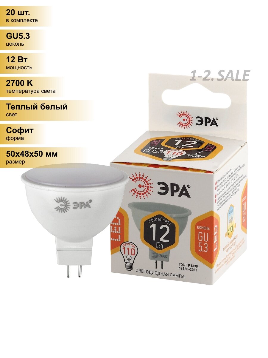 Купить (20 шт.) Светодиодная лампочка ЭРА стандарт MR16 GU5.3 220V 12W(860lm) 2700K 2K 50х48 LED MR16-12W-827-GU5.3 7484 Теплый белый. Цоколь GU5.3