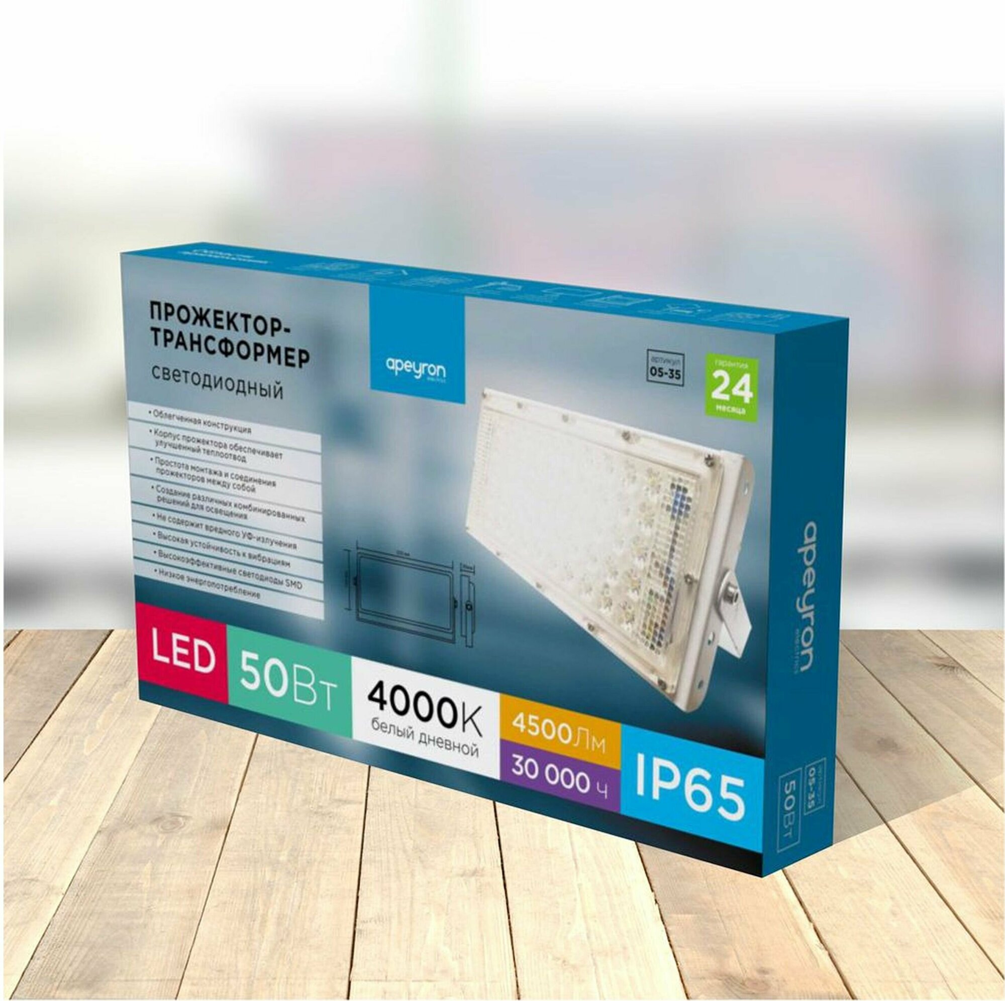 Прожектор светодиодный трансформер Apeyron 0535. Светодиодный фонарь. Светильник универсальный для подсветки дома, улицы или гаража. smd, 50Вт, IP65, 4500Лм, 4000К, 220-240В/50Гц, белый