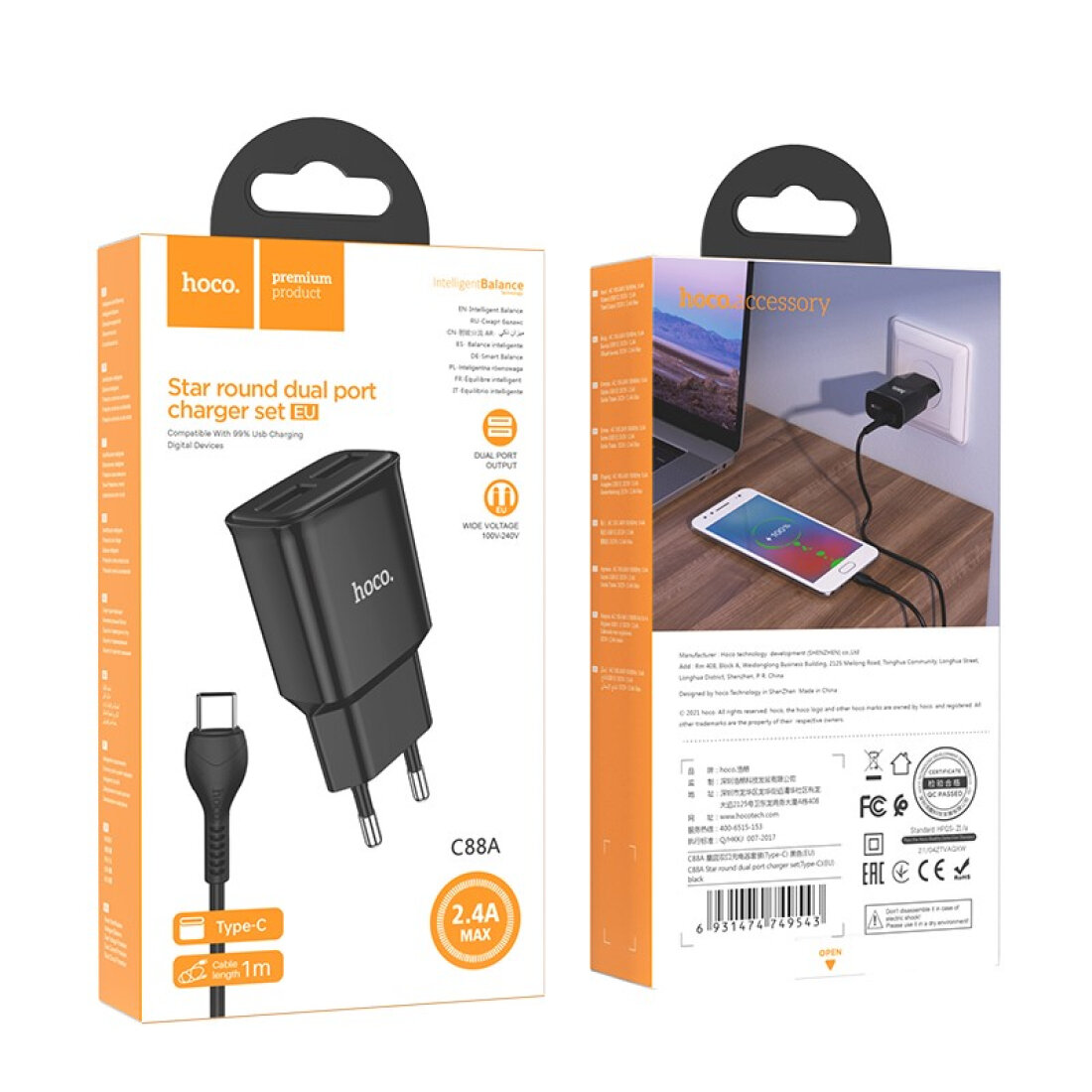 Сетевое зарядное устройство HOCO C88A Star 2xUSB с Кабелем USB - Type-C, 2.4A, 10.8W, черный