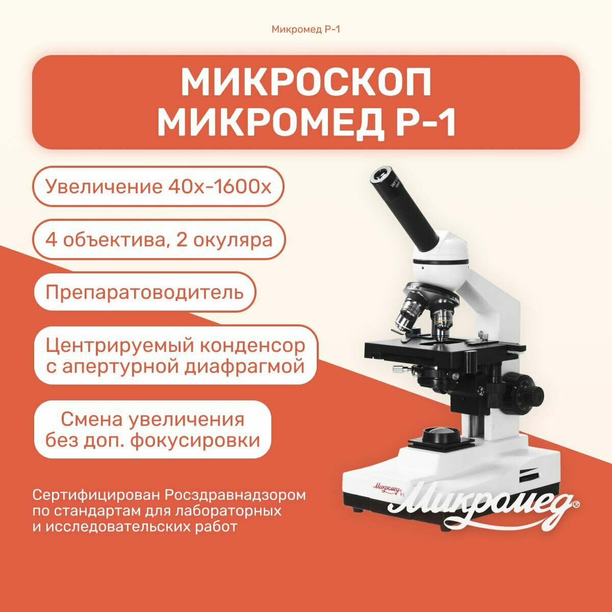 Микроскоп биологический Микромед Р-1 лабораторный для исследований, профессиональный, металлический интересное:
