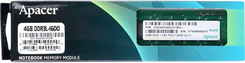 Apacer Модуль оперативной памяти SO-DIMM 4ГБ DDR3L SDRAM Apacer DV.04G2K.KAM (PC12800, 1600МГц, CL11) (ret)