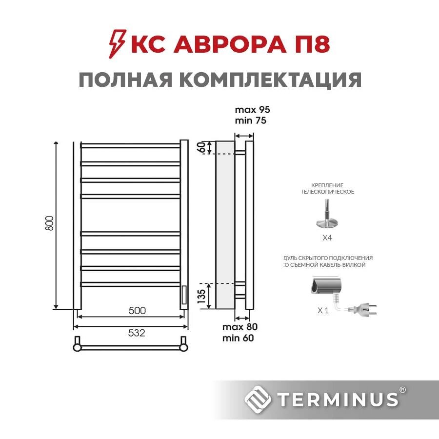 Полотенцесушитель электрический Terminus Аврора КС 9003 П8, 168 Вт, 500 x 800 мм, матовый белый