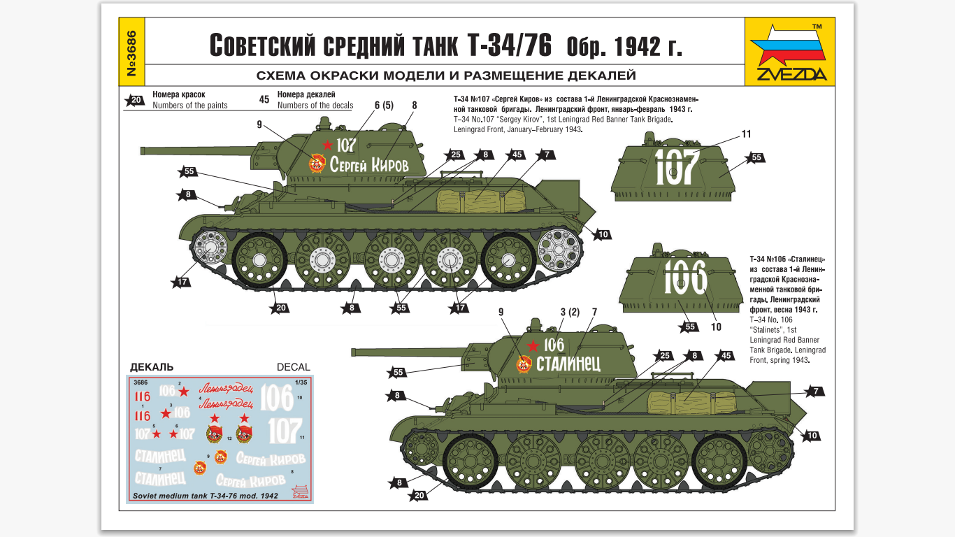 | Дополнительная информация | люки выполнены отдельными деталями; нейлоновая сетка для вентиляционных решёток, нить для имитации буксировочного троса; декаль для 3 вариантов: Т-34 №107 «Сергей Киров» из состава 1-й Ленинградской Краснознаменной танковой бригады, Ленинградский фронт январь-февраль 1943 г., Т-34 №106 «Сталинец» из состава 1-й Ленинградской Краснознаменной танковой бригады, Ленинградский фронт весна 1943 г., Т-34 № 116 «Ленинградец» из состава 1-й Ленинградской Краснознаменной танковой бригады, Красное село, январь 1944 г. |