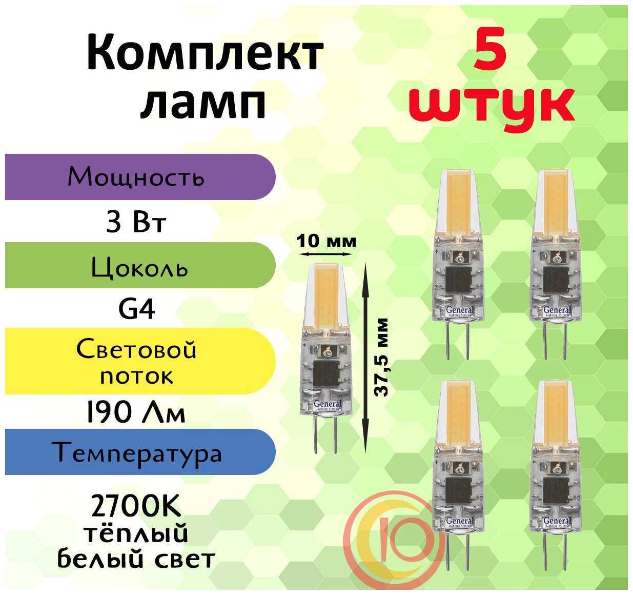 Светодиодные лампы 12 вольт, General, Комплект из 10 шт, Мощность 3 Вт, Цоколь G4, Теплый свет