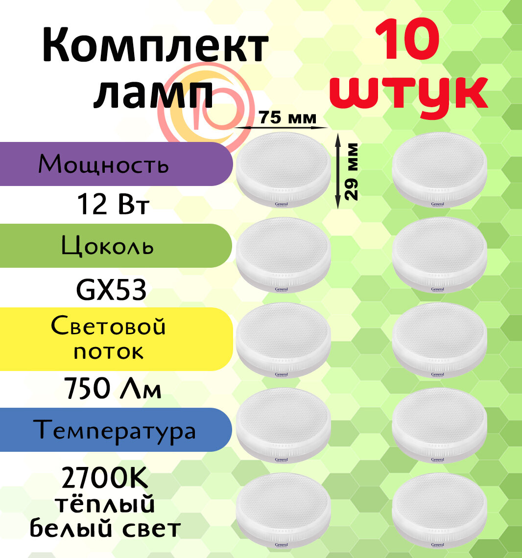 Лампочка светодиодная, General, Комплект из 10 шт., 7 Вт, Цоколь GX53, 2700К, Форма лампы Шайба, GX53